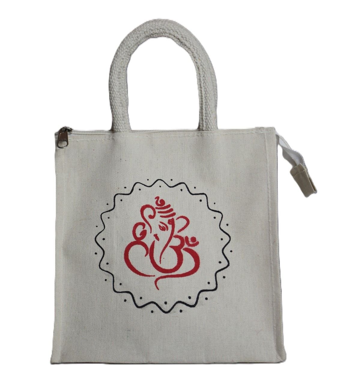 The highlight of this canvas bag is the stunning Lord Ganesha print—symbolizing blessings, success, and positive beginnings. The artwork is neatly printed on a pure white base, giving the bag a premium and divine appearance that suits all age groups. This design makes it a perfect choice for gifting during festivals like Ganesh Chaturthi, housewarming ceremonies, weddings, return gifts, and spiritual events.