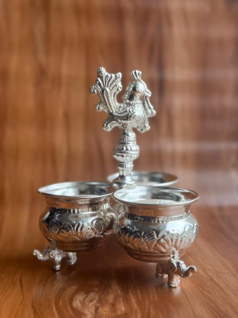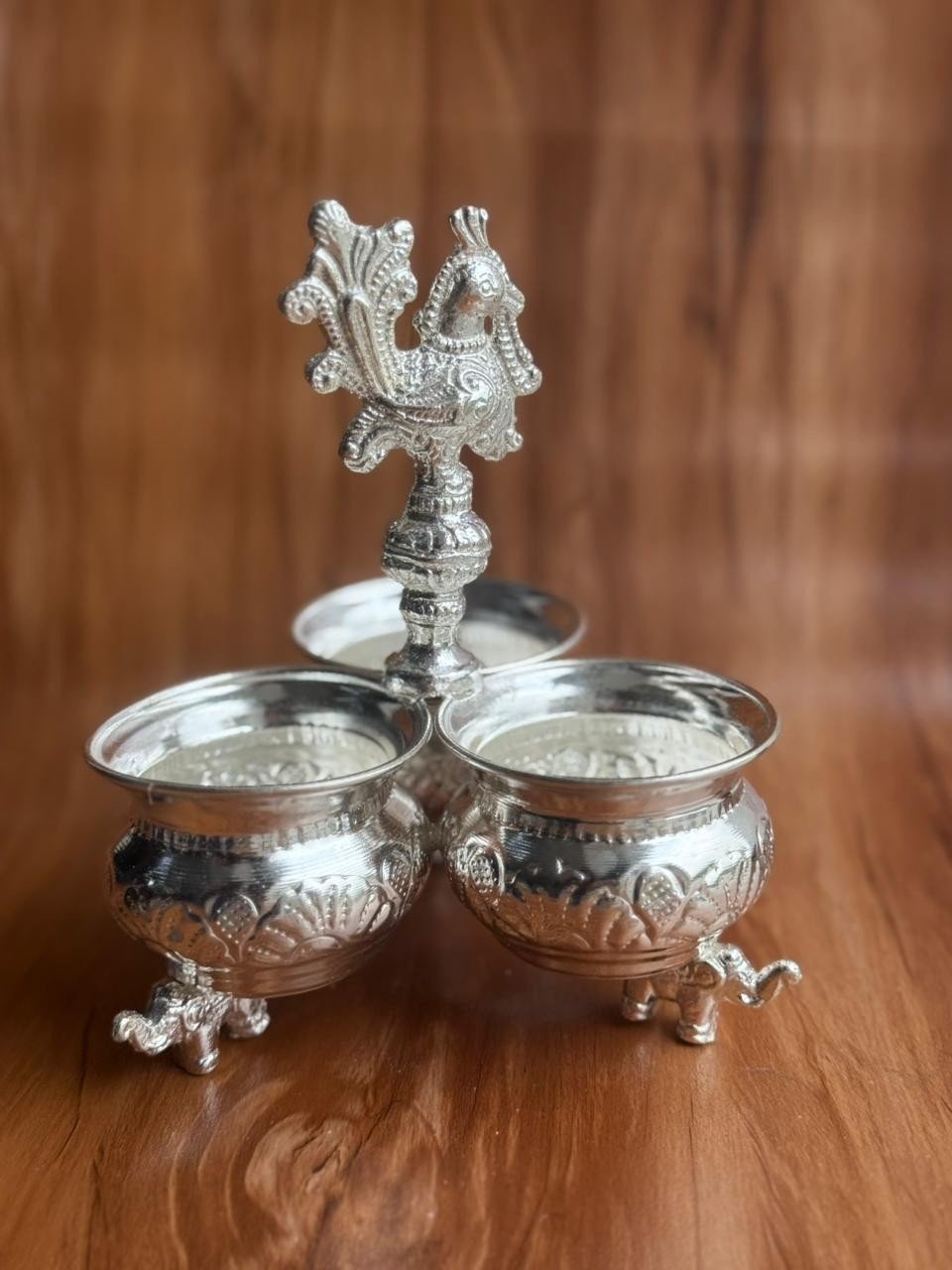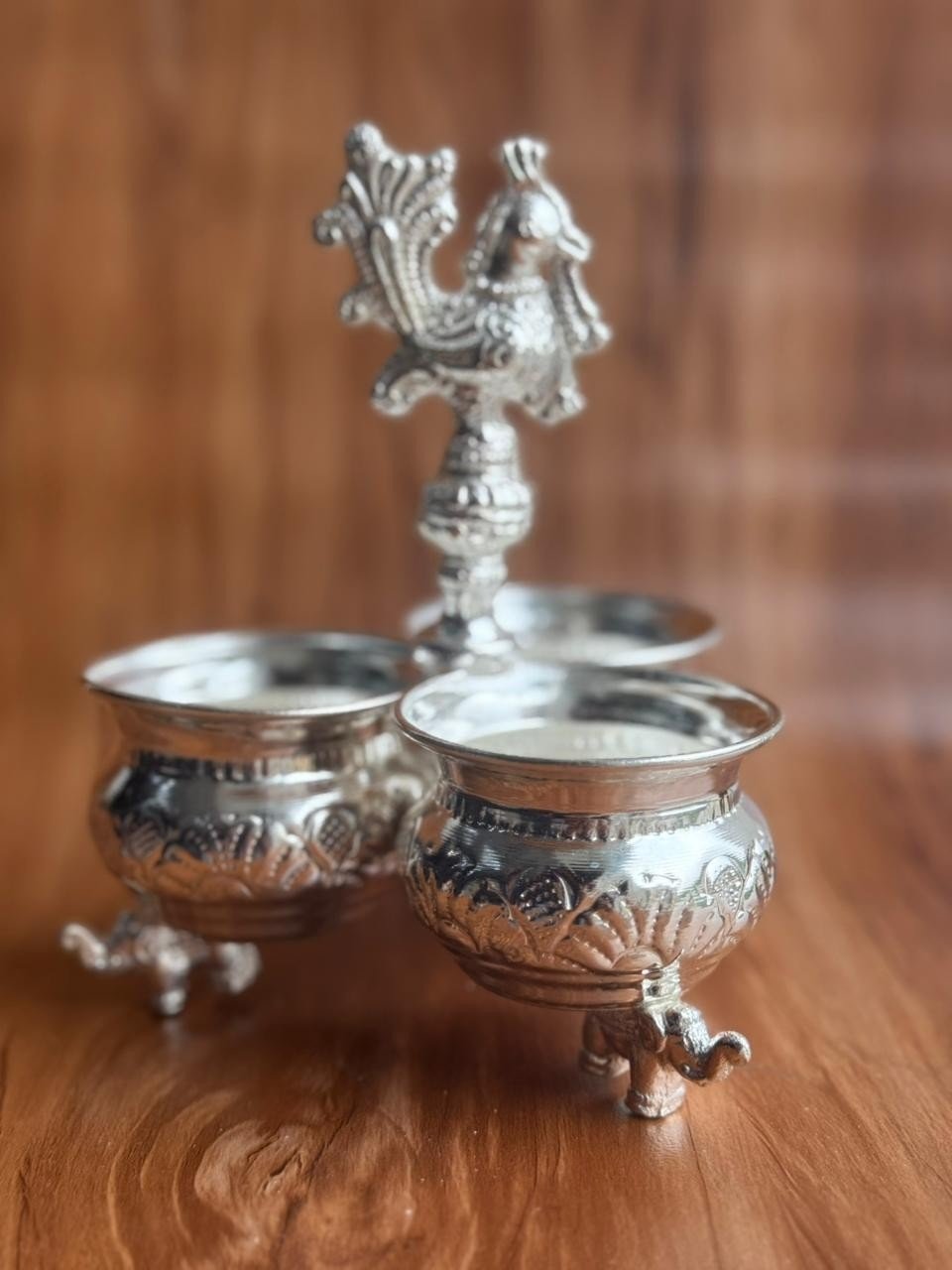 The polished finish gives the product a premium shine while the sturdy metal frame makes it ideal for daily use. Moreover, the triple-pot layout offers more convenience than standard holders because you can access all three pooja essentials quickly during rituals. The detailed design also makes this German silver pooja item stand out among other pooja items, adding charm and functionality to your pooja plate.