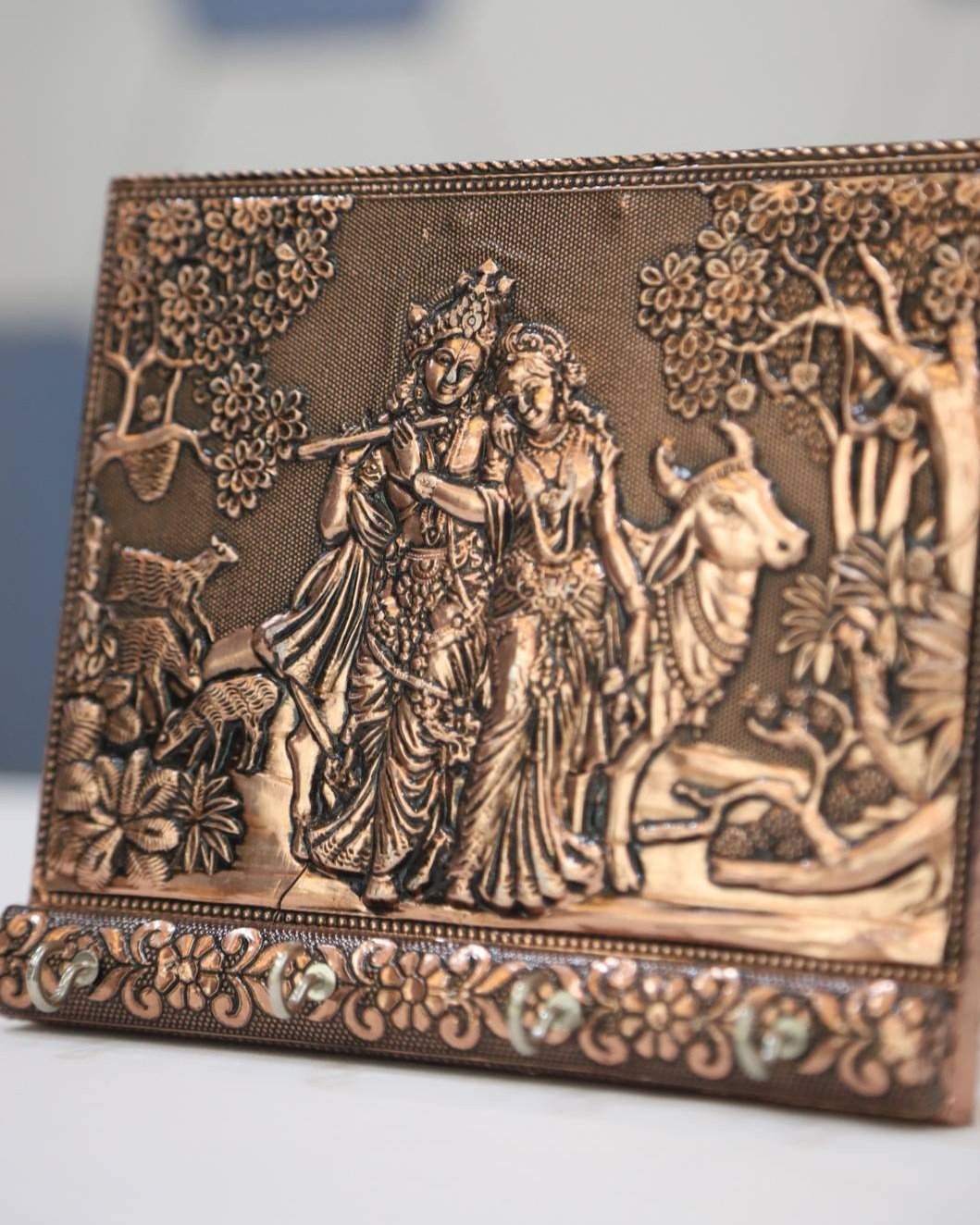 In conclusion, this Radhe Krishna–inspired wall accessory turns simple key storage into a graceful experience. With its artistic finish, sturdy build, and spiritual significance, it goes beyond being just an organizer. Explore this elegant copper keyholder from Pandian Bag today and bring home a product that beautifully combines faith, function, and fine design.
