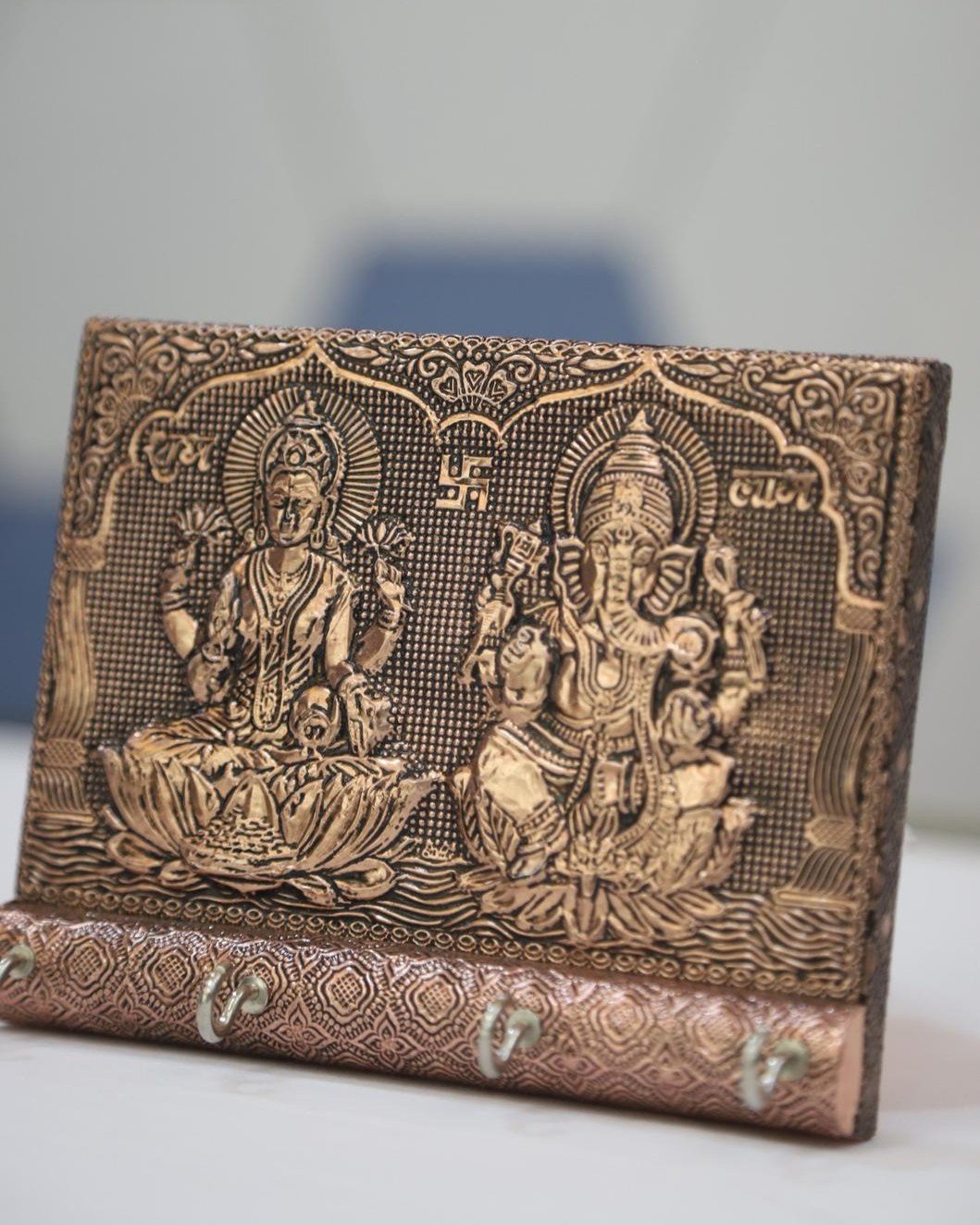 A thoughtfully designed keyholder brings both organization and elegance into your daily routine. This copper-finish Ganesha and Saraswathi-themed wall accessory blends divine beauty with practical use, making it an ideal addition to any home. From the moment you place it near your entrance, it creates a welcoming atmosphere while keeping your keys safely in one place.